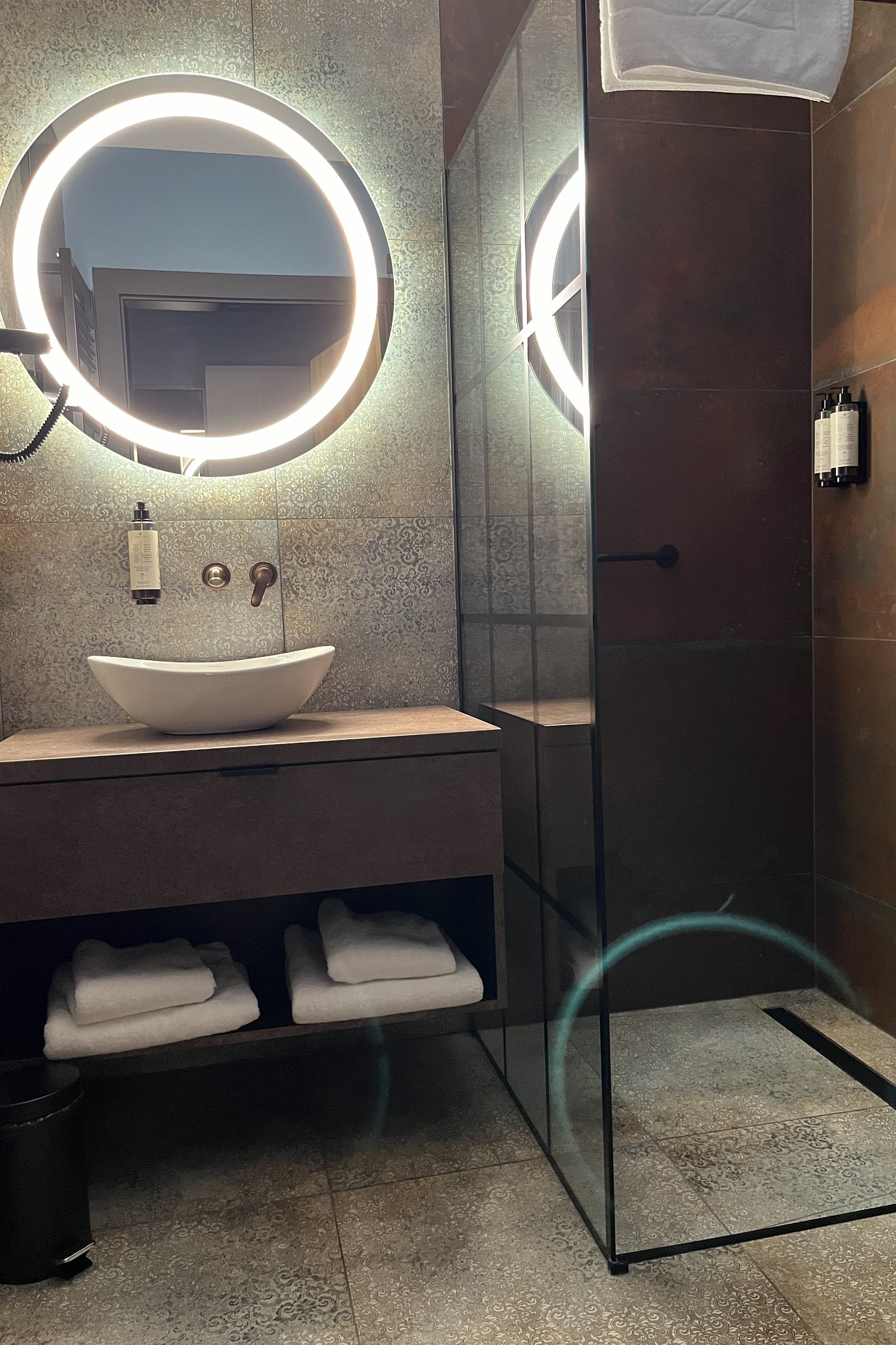 Przestronny pokój z dwoma osobnymi łóżkami, designerskimi akcentami (wiszące lampy w kolorze miedzianym, skórzane, pikowane wezgłowie, lekko odymiona tapeta w barokowym stylu). W pokoju panele.