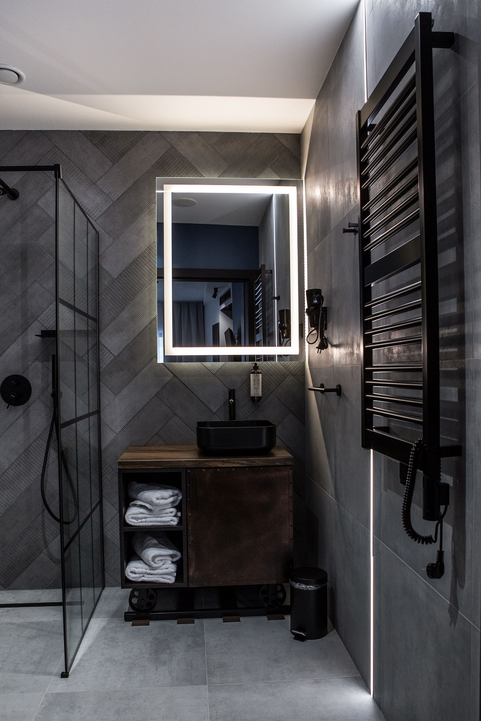Przestronny pokój z dużym łóżkiem typu king, designerskimi akcentami (wiszące lampy, tematyczne, stylowe ściany i zaskakujące umywalki na torach) oraz prywatnym balkonem. W pokoju panele.