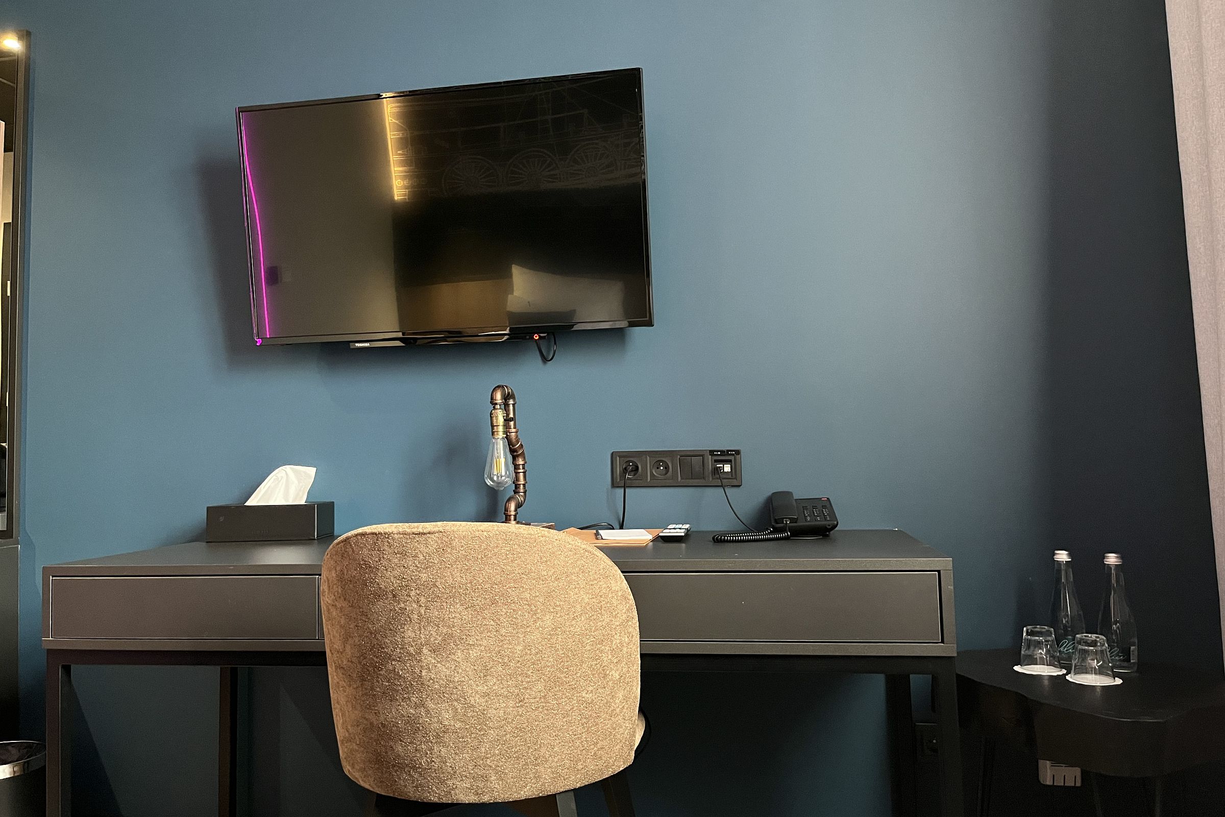 Przestronny pokój z dwoma osobnymi łóżkami, designerskimi akcentami (wiszące lampy, tematyczne, stylowe ściany i zaskakujące umywalki na torach). W pokoju panele.