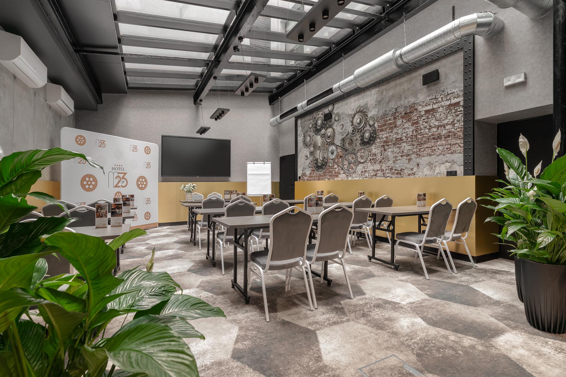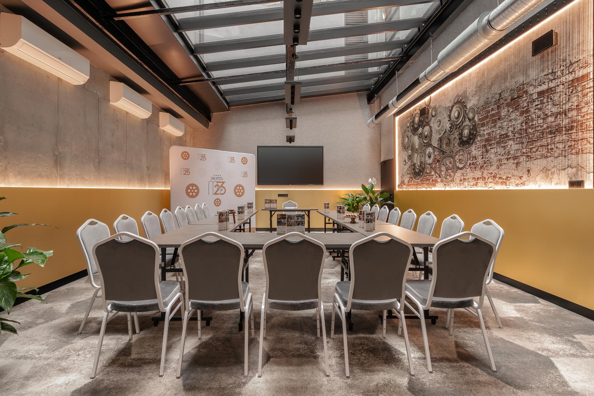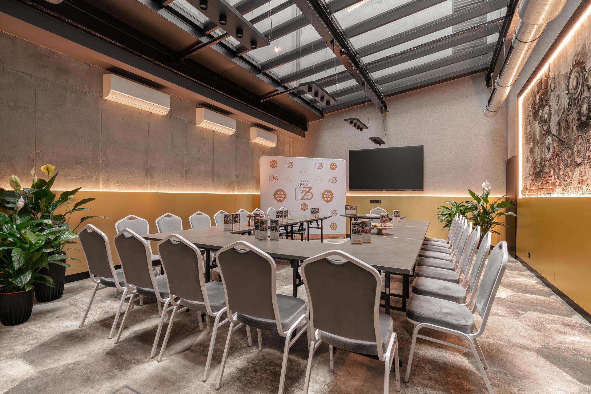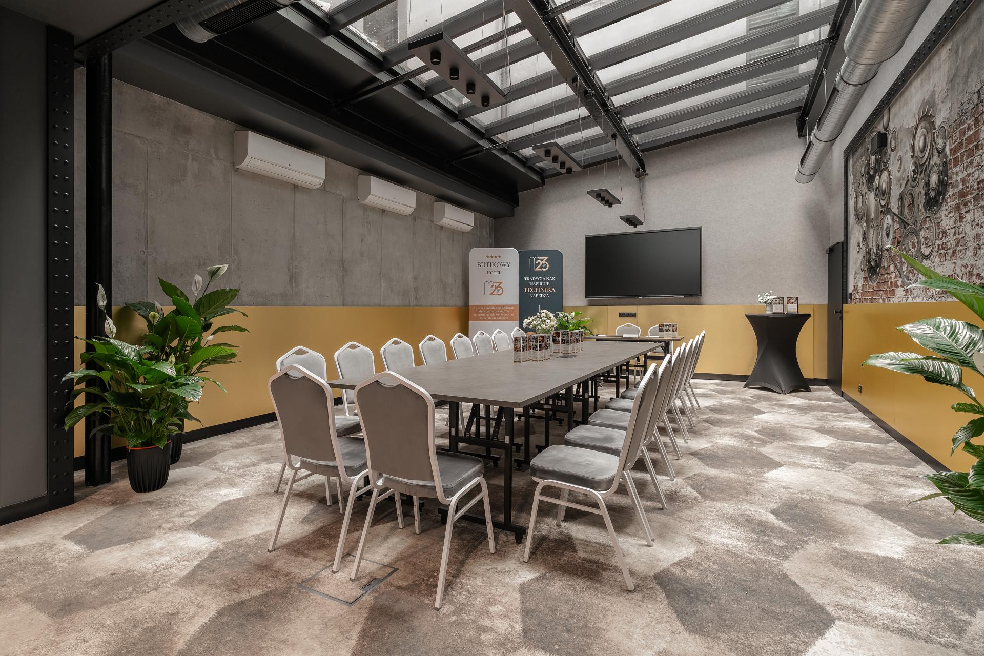 Sala konferencyjna Fabryka to doskonałe miejsce na organizację kameralnych spotkań biznesowych, szkoleń czy warsztatów. Usytuowana w sercu hotelowego patio, wyróżnia się niepowtarzalnym przeszklonym sufitem, który w naturalny sposób doświetla wnętrze i tworzy inspirującą atmosferę sprzyjającą koncentracji oraz kreatywnym dyskusjom.