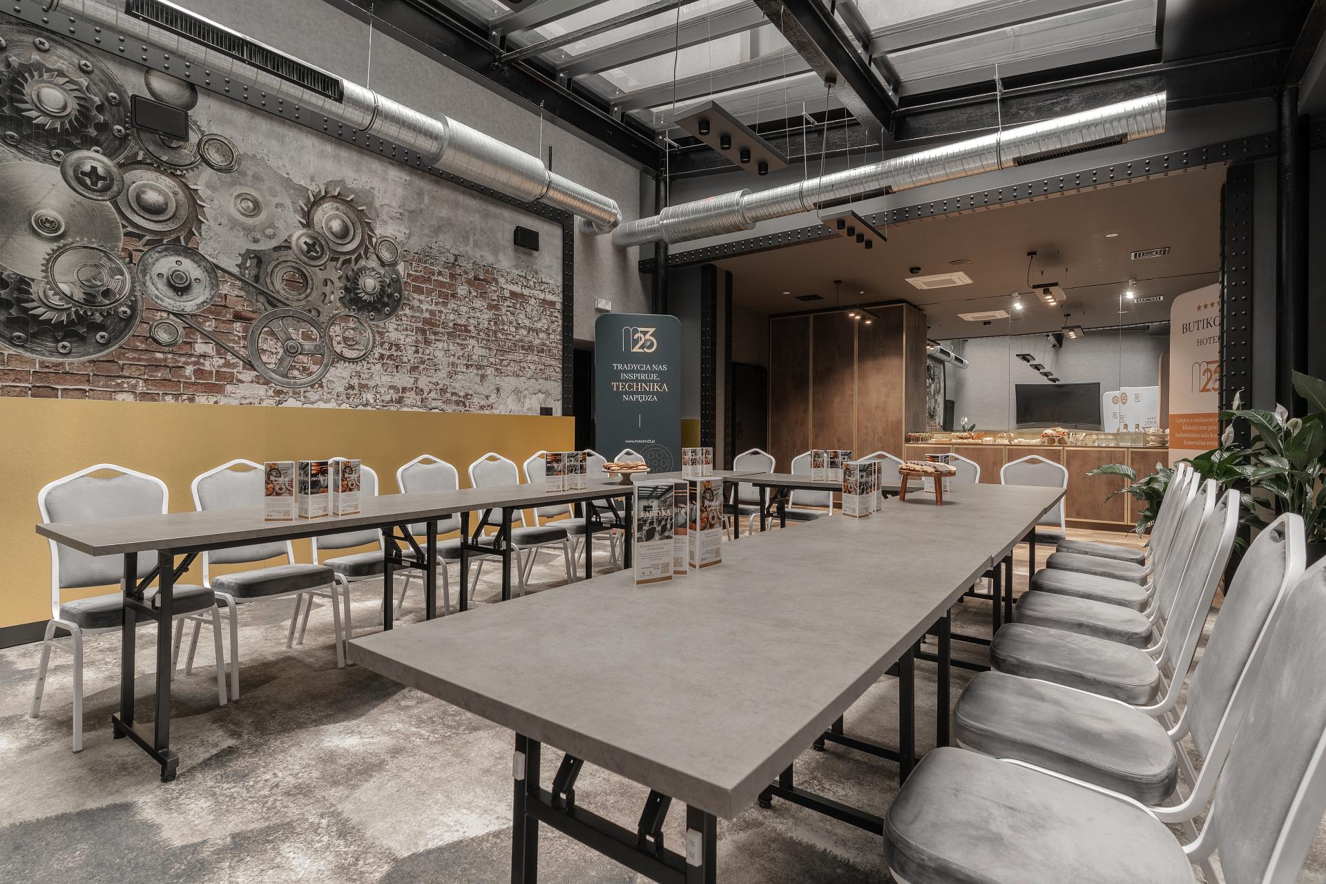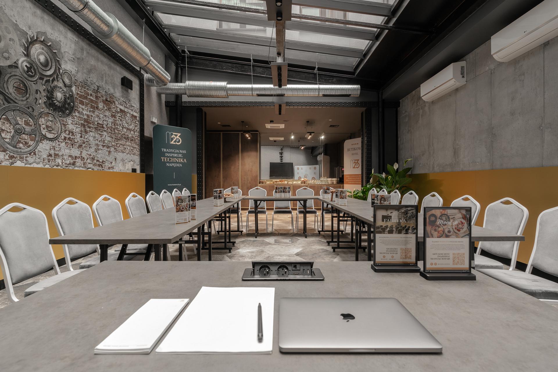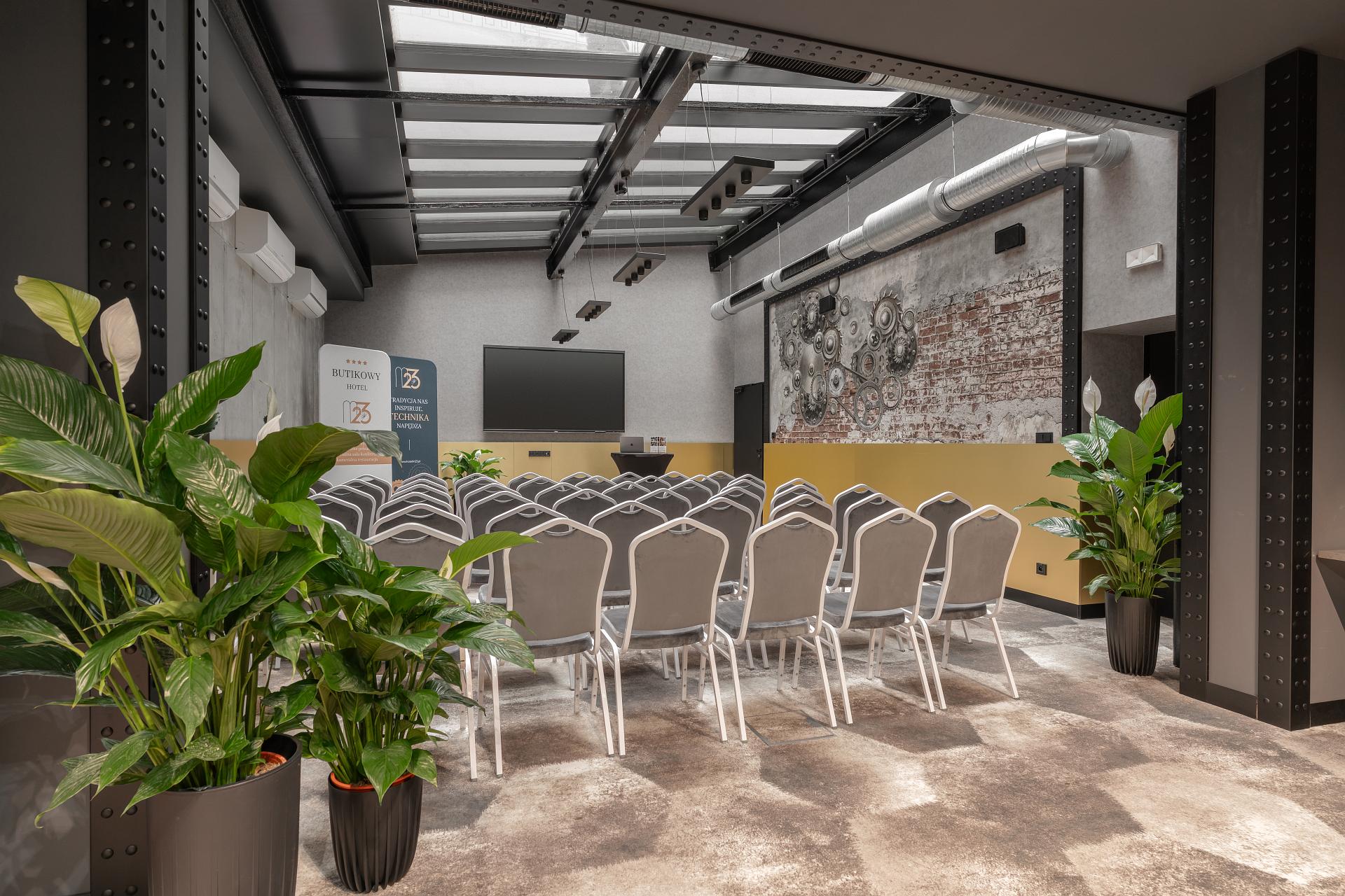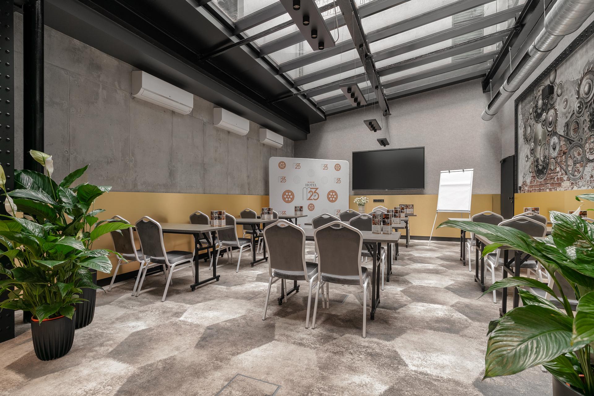 Sala konferencyjna Fabryka to doskonałe miejsce na organizację kameralnych spotkań biznesowych, szkoleń czy warsztatów. Usytuowana w sercu hotelowego patio, wyróżnia się niepowtarzalnym przeszklonym sufitem, który w naturalny sposób doświetla wnętrze i tworzy inspirującą atmosferę sprzyjającą koncentracji oraz kreatywnym dyskusjom.