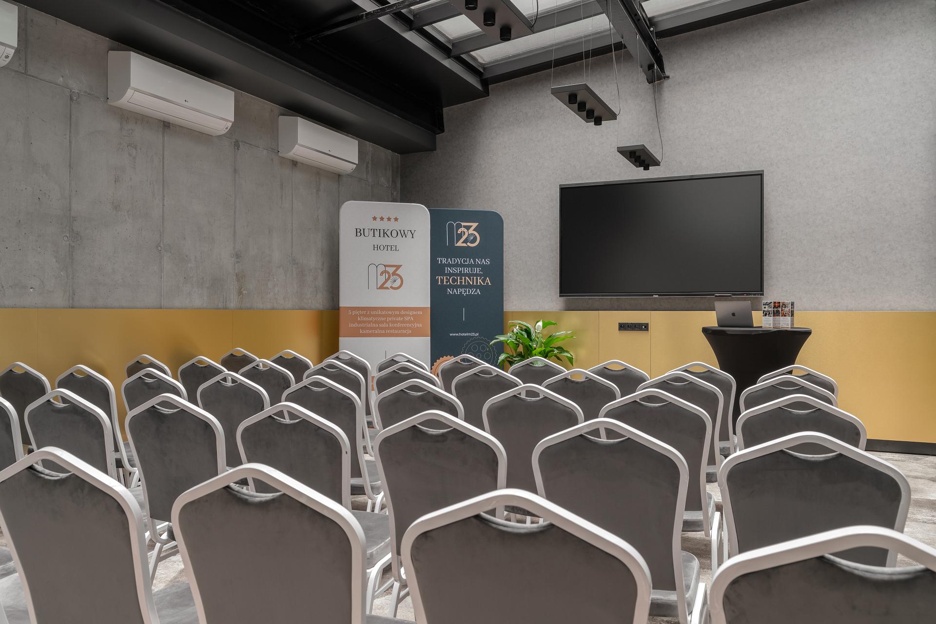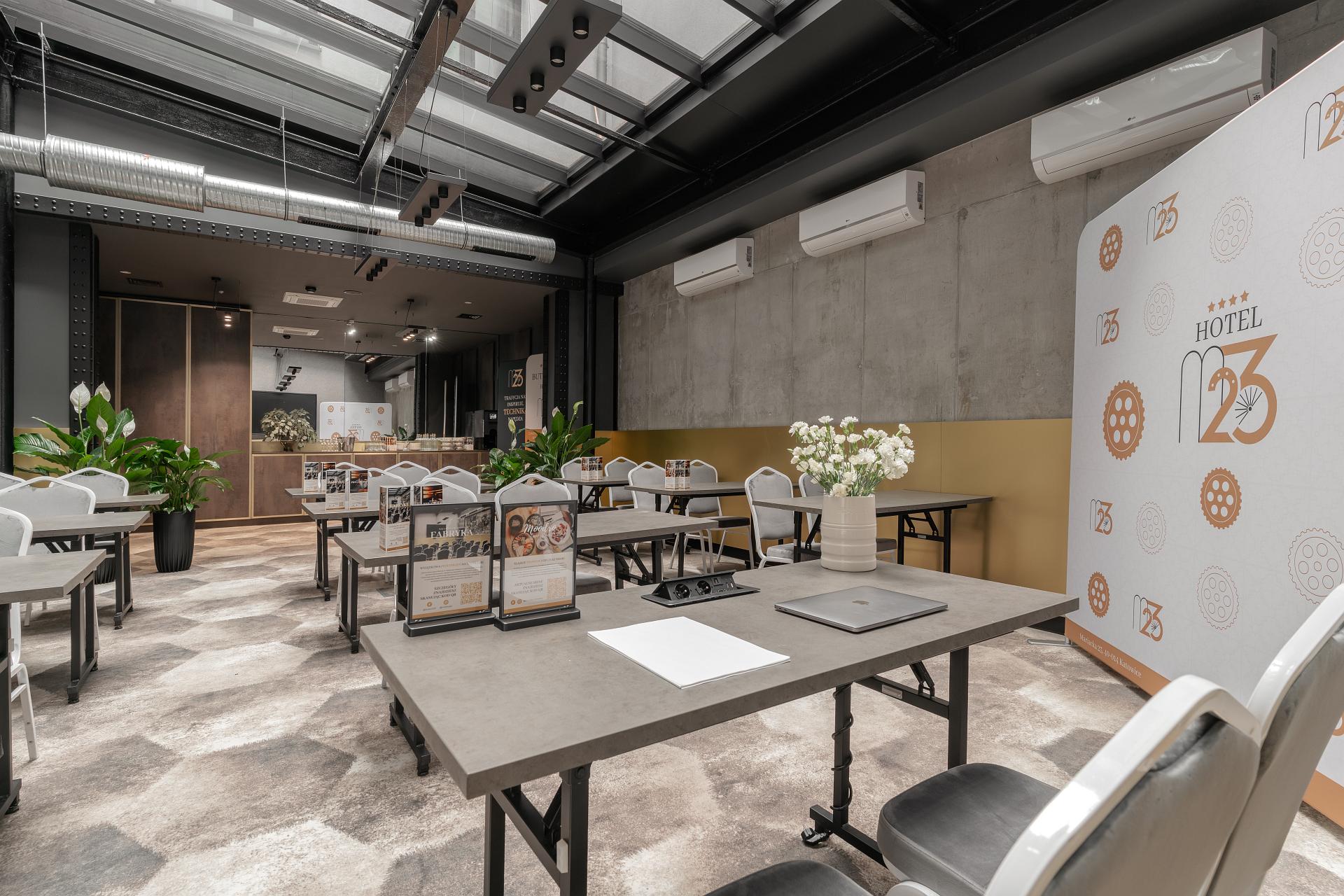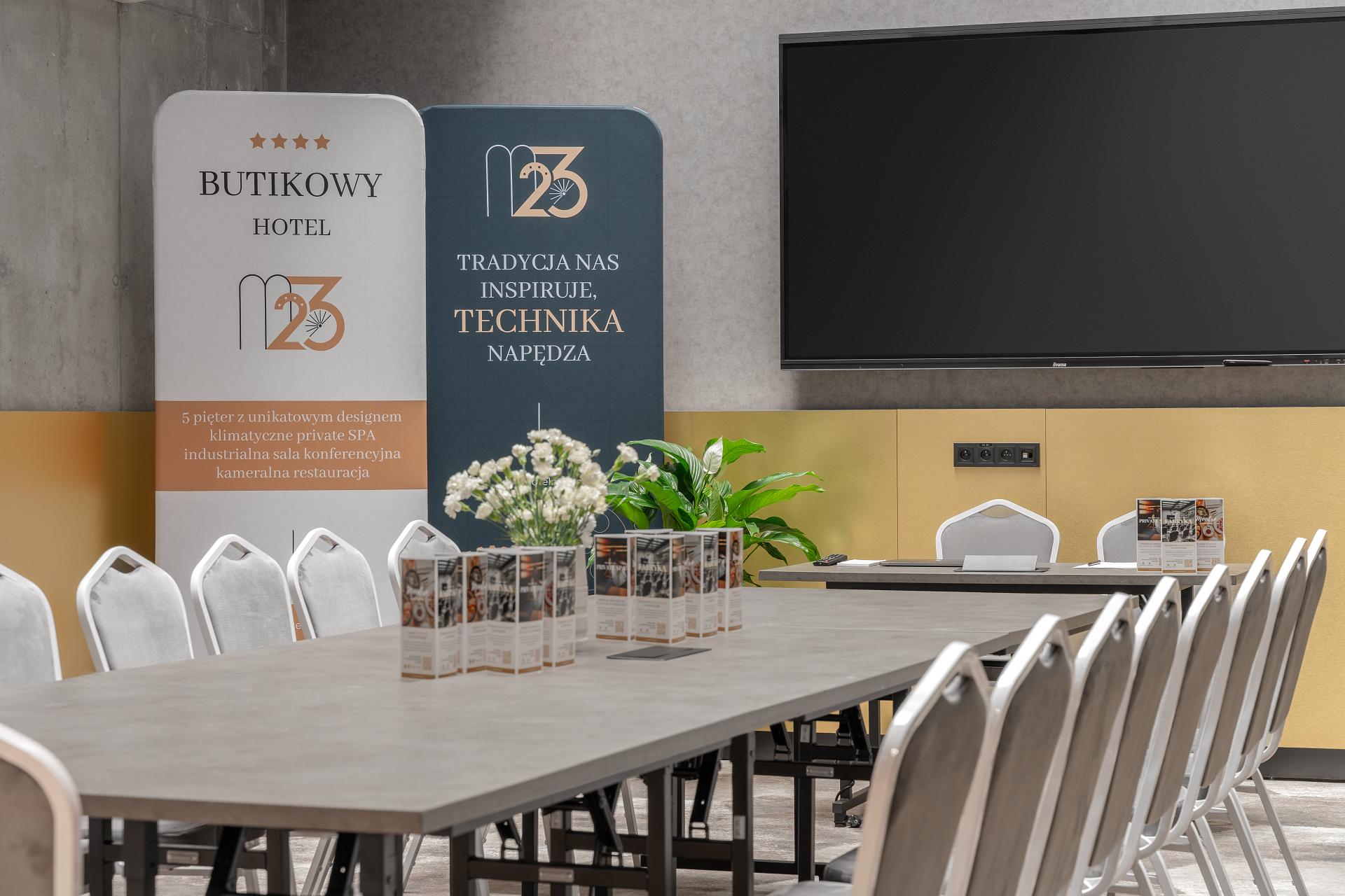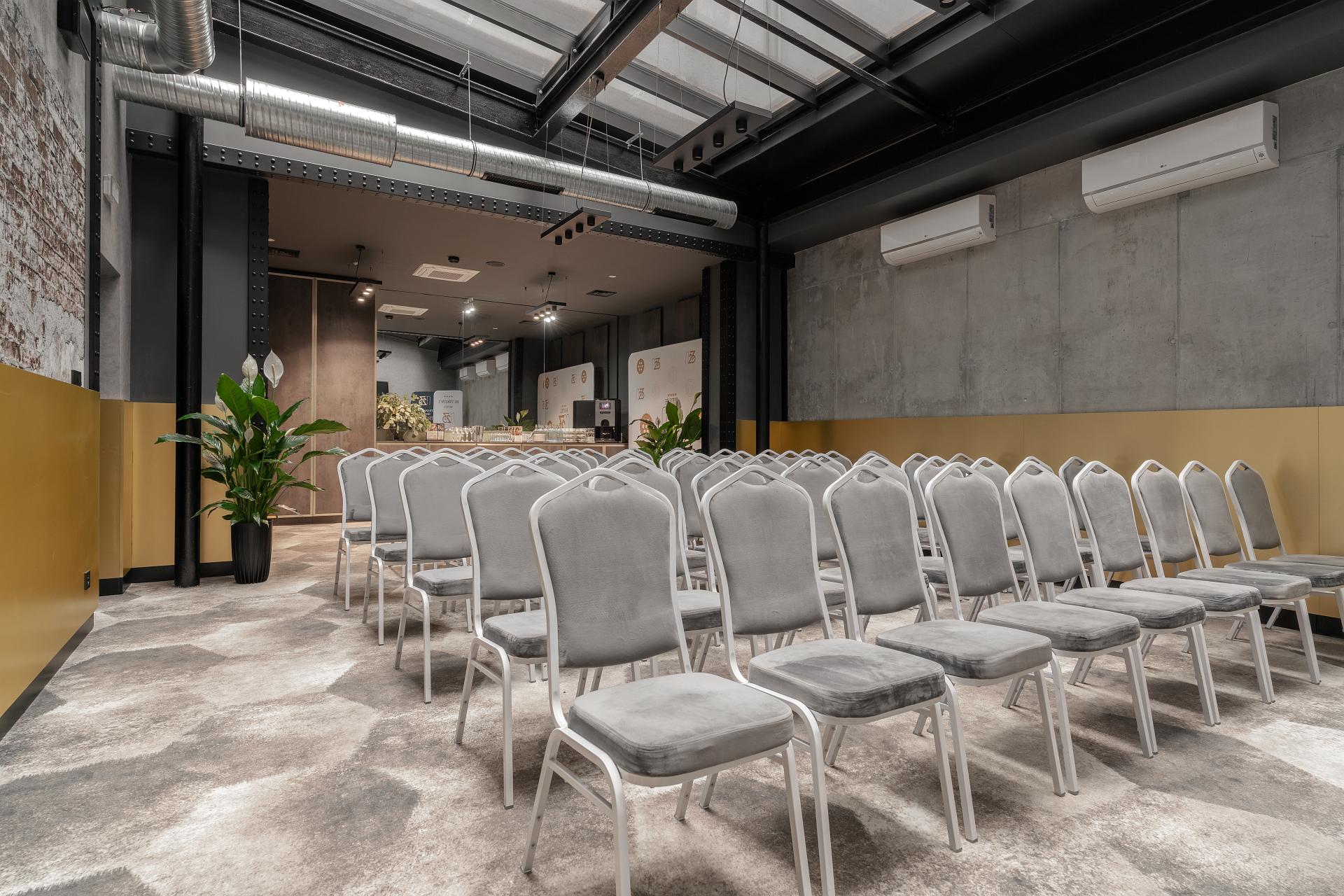 Sala konferencyjna Fabryka to doskonałe miejsce na organizację kameralnych spotkań biznesowych, szkoleń czy warsztatów. Usytuowana w sercu hotelowego patio, wyróżnia się niepowtarzalnym przeszklonym sufitem, który w naturalny sposób doświetla wnętrze i tworzy inspirującą atmosferę sprzyjającą koncentracji oraz kreatywnym dyskusjom.